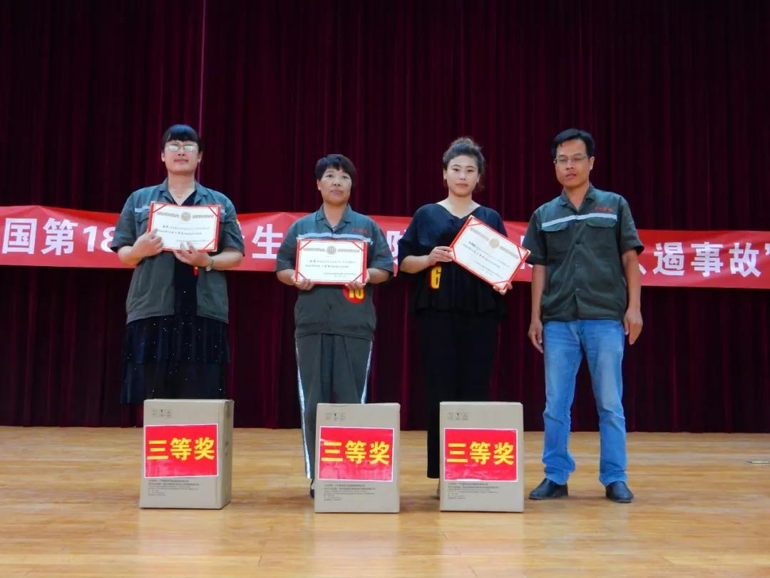 三等獎(jiǎng)三名,由安環(huán)部杜部長(zhǎng)為來(lái)自動(dòng)力廠獲獎(jiǎng)選手段冉、來(lái)自熟料廠的獲獎(jiǎng)選手李潔和來(lái)自煉鋼廠的獲獎(jiǎng)選手李艷琦分別頒發(fā)榮譽(yù)證書及獎(jiǎng)品,并合照留念。